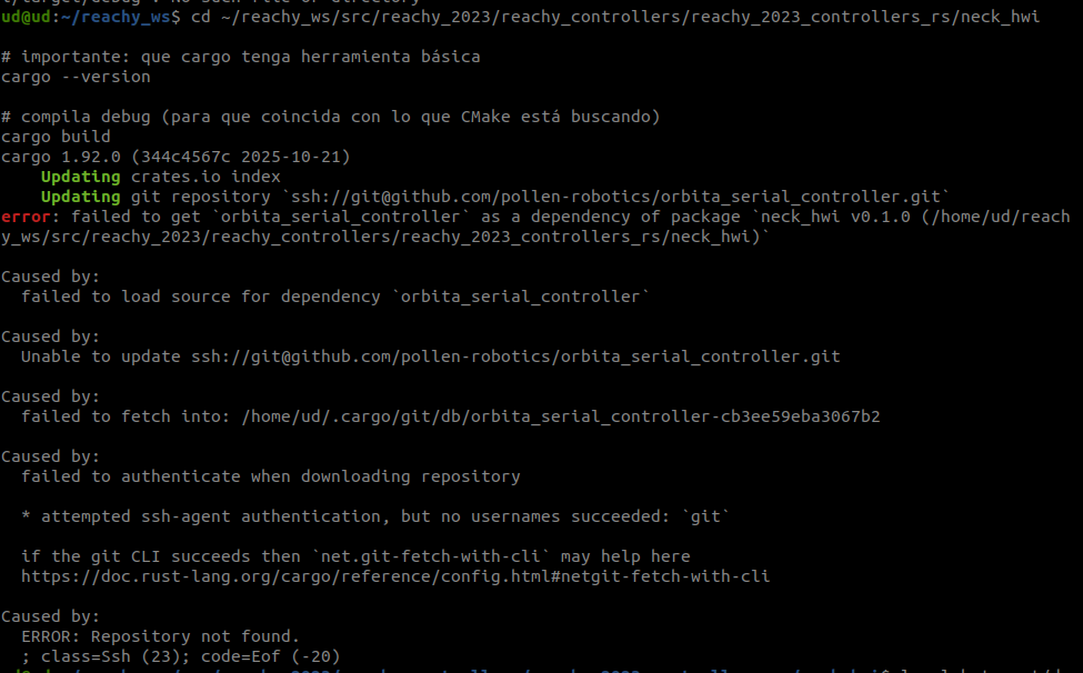 Cargo reports “Repository not found” and fails to authenticate. I’ve checked that my GitHub SSH setup is correct (ssh -T git@github.com works fine), but I don’t seem to have access to that repository. Because of this, neck_hwi never builds (the target/ directory is never created), and then neck_system_hwi fails at link time because libneck_hwi.a is missing.