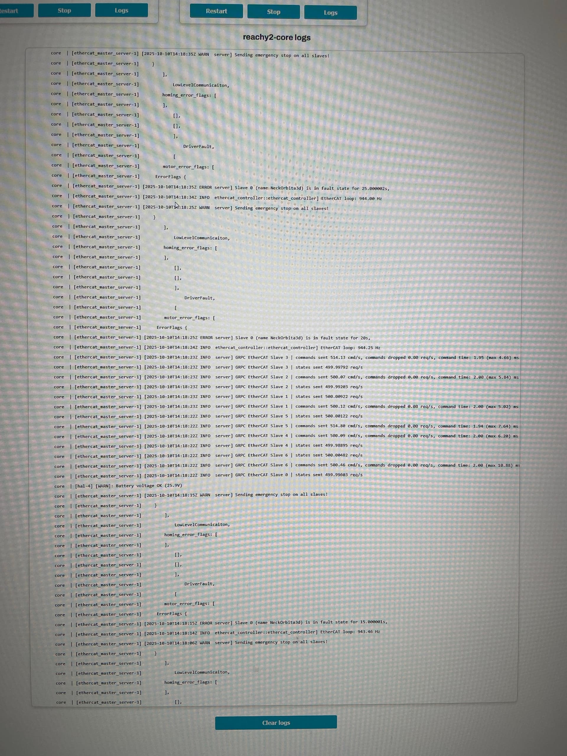 core | [ethercat_master_server-1] [2025-09-25T11:39:20Z ERROR server] Slave 0 (name NeckOrbita3d) is in fault state for 135s,