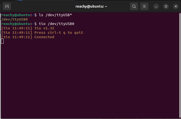 tio Command & Console: I have attached the screenshot of the console when executing tio /dev/ttyUSB0. Even after pressing ‘Enter’ multiple times and trying to type, the terminal just hangs and remains completely unresponsive.